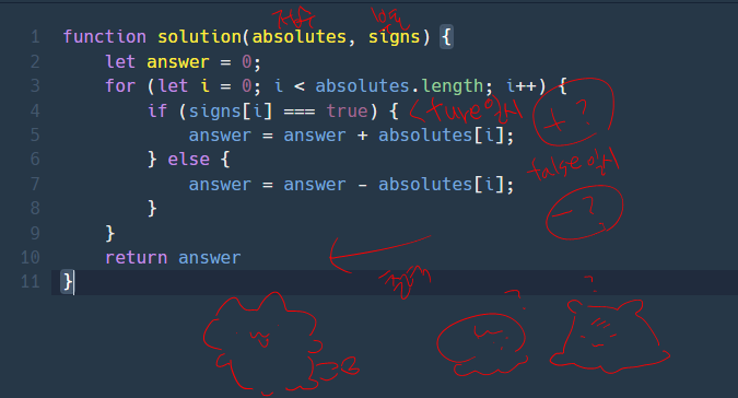 reduce에 초기값을 0으로 설정한 뒤 각 요소를 돌면서 각 요소 index와 같은 index의 signs 배열 요소가 true면 누산값에 값을 더하고, false면 값을 빼는 방식으로 진행하여 결과를 얻고 문제를 해결한것 같다